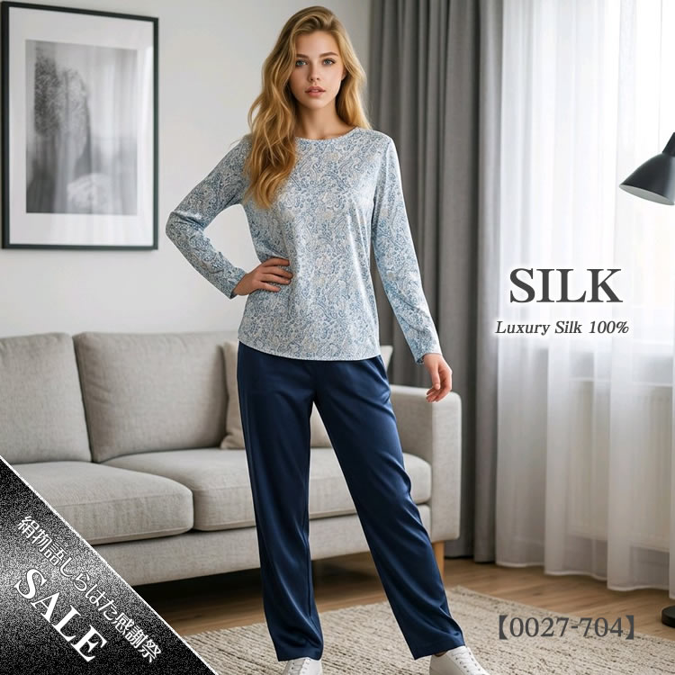 【HANAMOLI】シルク100%丸首パジャマ 【無地ズボンのワンマイルウエア】 【ポーチは付いてません】【35%OFF】 |