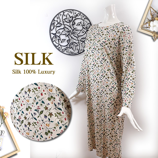【在庫のみ価格据え置き】サプライズ価格【40%OFF】 シルク100%長袖ワンピースネグリジェ【人気の木の実柄】 【リラックスタイムのアイテムに】 |