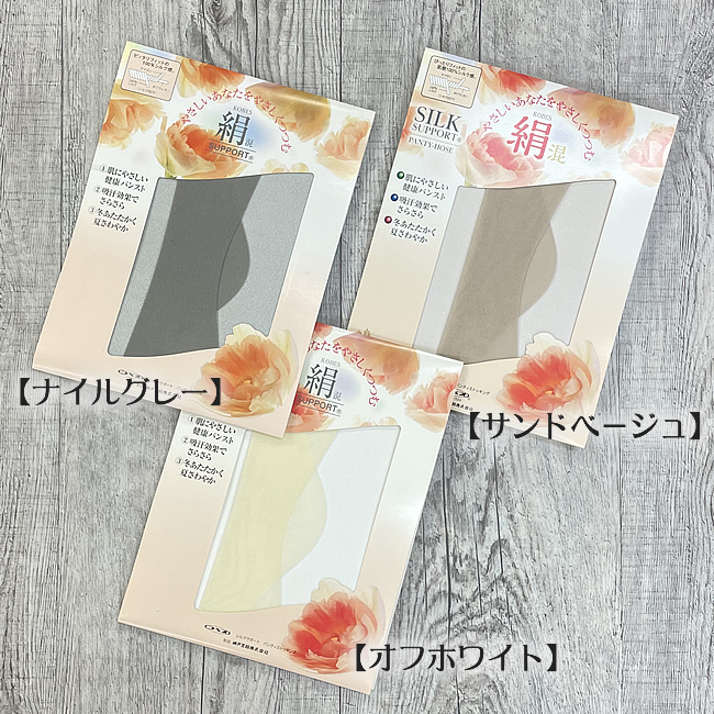 是非お試し下さい!日本製 (画像の4色のほかに、ブラック・オフホワイトも御座います) ☆.゜,.,;°♪。,,.;‘☆.゜,.,;°♪。,,.;‘☆.゜,.,;°♪。,,.;‘☆.゜,.,;°♪☆.゜,.,;°♪。,,.;‘☆.゜,.,;°♪。,,.;‘☆.゜,.,;°♪。,,.; 〜お客様の声〜) 足が痒くなりませんでした。それがつらくていつもどうやったらストッキングを履かずにいられるかと苦労していた問題が解決しました。ありがとうございます。 おそらくもう10年ほど使わせてもらっています。蒸れないし、ちくちくしないし、とにかく素肌に快適です。最初は価格的に「贅沢かな」と思いましたが、思いのほか丈夫で長持ちなので、今はむしろお得だと思っています。もう、普通のストッキングを買う気にはまったくなれません。色は、私の素肌に一番近い色見のスモークベージュを愛用させていただいています。ナチュラルで気に入っています。 サラサラして履心地よい製品です。冬は二枚重ねて使用しています。暖かいですよ。そして透け感もあります。 数年前からシルクストッキングを愛用していますが、とにかく通気性が良く足が蒸れることがないので、 一日中大変快適です。また足がシルク効果でツルツルすべすべになります。 色は何種類が試しましたがキサスが良いかも。 乾燥性敏感肌でストッキングをはくと痒くなっていましたが、このストッキングはさらっとしていて時間が たっても大丈夫でした。汗をかく暑い日に着用したところ、ストッキングにある張り付くような不快感がなく、 さらっとした履き心地でした。仕事柄ストッキングは必須のため、夏は蒸れて履くのが嫌でしたが、 このストッキングなら気にせず過ごせそうです。 アトピー性皮膚炎で普通のストッキングは履けないのですが、こちらのストッキングだけは大丈夫なので、とてもありがたいです。値段は少々高いですが、丈夫で長持ちしますし、かゆくならないので、それだけの価値はあると思います。また、夏は蒸れず、冬は暖かいので快適です。 アトピーの私は、こちらの商品と出会うまでストッキングは我慢して履くものだと思っていました。会社の制服規定で仕方なくストッキングを着用していましたが、脚がムズムズチクチク痒くなり、トイレでガリガリと掻くことがたびたびありました。そんなある日、シルク混のこちらの商品のことを知り、藁をもすがる思いで試してみました。時間が経っても不快な痒みもなく、掻き壊しが減り、またシルクの効果なのか肌の状態が良くなりました。夏場でもかかとのひび割れがありましたが、ひび割れも起こらなくなりました。伝線しにくいところも良かったです。 ☆.゜,.,;°♪。,,.;‘☆.゜,.,;°♪。,,.;‘☆.゜,.,;°♪。,,.;‘☆.゜,.,;°♪☆.゜,.,;°♪。,,.;‘☆.゜,.,;°♪。,,.;‘☆.゜,.,;°♪。,,.; |