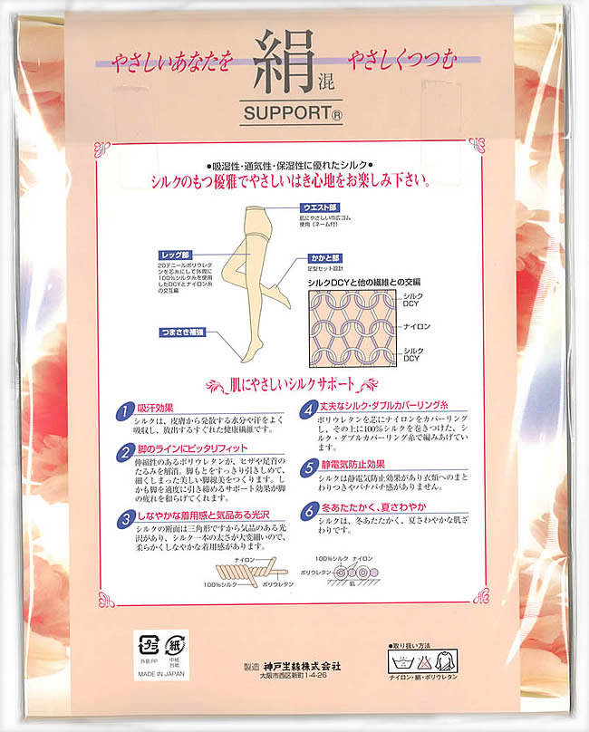 ポリウレタンの芯糸にシルク100%を巻きつけて編み上げられたシルク サポートパンストですが。シルクDCYの方が太いのでお肌に当たる面はほとんどシルクとなります。お肌の弱い方にも安心して履いていただけます。 |